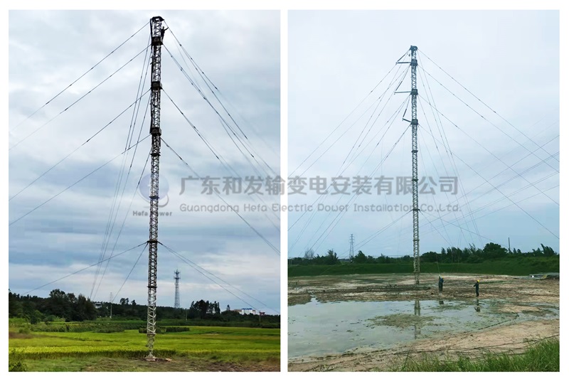 廣東和發(fā)輸變電安裝有限公司項目負責人了解工程概況后馬上奔赴現(xiàn)場展開實地勘查工作,根據(jù)實際情況制定施工設計方案。因涉及的遷改高壓線路為110kV坡田甲乙線同塔雙回線路,需對110kV坡田乙線#51—#55段和#113—#114段進行臨時轉供電。廣東和發(fā)與業(yè)主單位及相關部門協(xié)商后決定采用具備“方便、快捷、高效、經(jīng)濟”等多項優(yōu)點的ERS應急性專用型桿塔作為臨時轉供電線路桿塔,共組立3基。